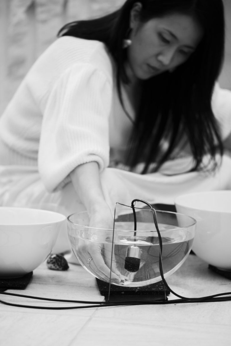Tomoko Sauvage est une compositrice et artiste franco-japonaise née à Yokohama et basée à Paris. Elle a inventé un instrument électro-aquatique unique, les « waterbowls », combinant eau, bols en porcelaine et hydrophones. Par des gestes presque rituels, elle transforme gouttes, vagues et bulles en paysages sonores méditatifs, explorant l’aléatoire, la matérialité et l’écoute profonde.